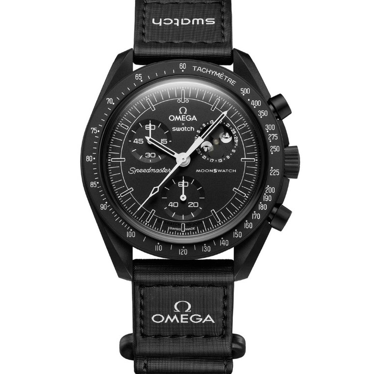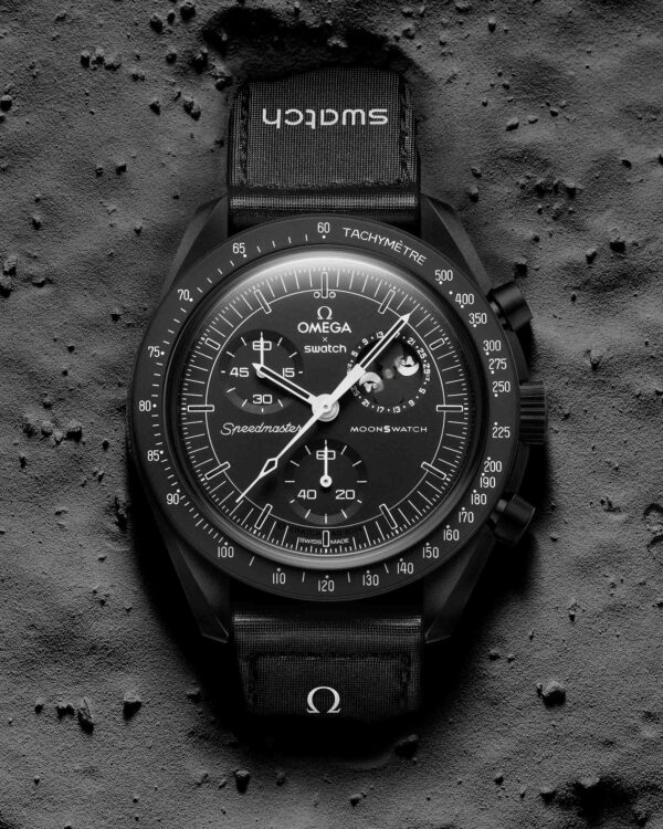 ساعت امگا سواچ Omega x Swatch Speedmaster MOO-MK، محصول مشترک Omega و Swatch، با طراحی تمام مشکی و سبک اسپرت ارائه شده است. حضور همزمان لوگوهای Omega و Swatch روی صفحه، نمادی از این همکاری منحصر به فرد میباشد.