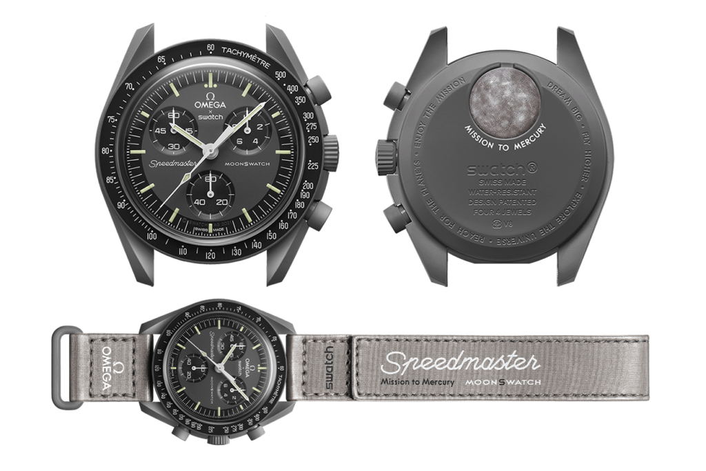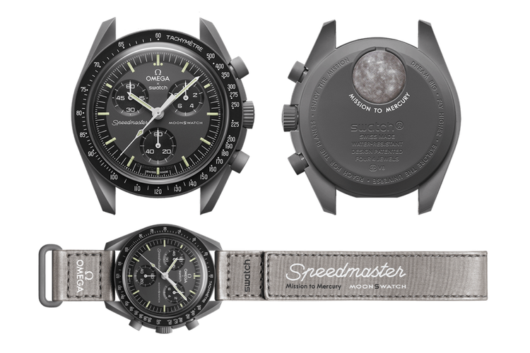 ساعت امگا سواچ Omega x Swatch Speedmaster MER-M نتیجهی همکاری خلاقانهی بین دو برند بزرگ ساعتسازی، امگا و سواچ میباشد. این مدل امگا با بند چرم (چسبی) خاکستری و قاب طوسی پرنگ طراجی شده است.